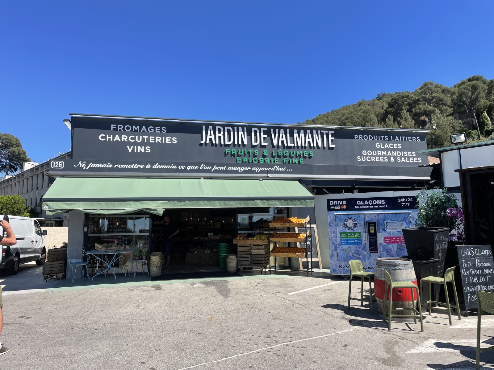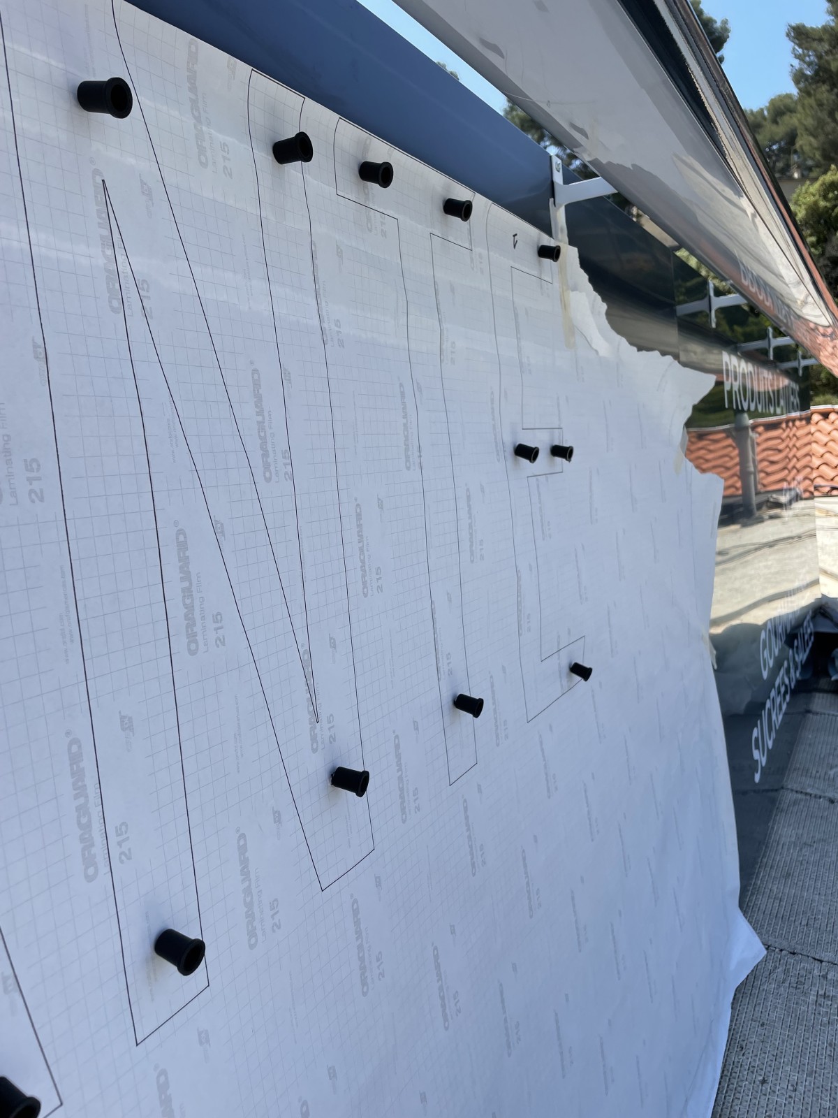Pour les jardins de Valmante à Marseille, nous avons commencé par décoller les films adhésif sur l’enseigne existante, puis nous avons créé une enseigne non lumineuse en lettres PVC fixé sur entretoise pour un effet de relief. Une partie des lettres ont été recouvertes d’un film adhésif polymère vert.